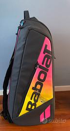 Vendo borsone da tennis Babolat Pure Rafa da 12 racchette, usato ma in buone condizioni. e robusto, perfetto per trasportare tutta l'attrezzatura. L'unico difetto è una leggera scoloritura su un lato, come si vede in foto, ma non influisce sulla funzionalità.