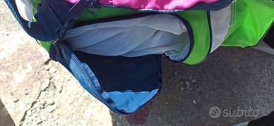 Borsone da tennis della Lotto, con varie tasche e inserti sia per le scarpe che per la racchetta stessa.