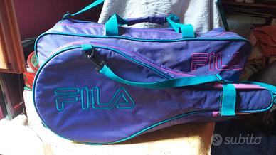 Grande borsone da tennis marca FILA con borsa per racchette dim circa 70x35x25 cm colore blu bordi verde acqua e fondi violetto custodia racchetta estraibile tessuto lavabile