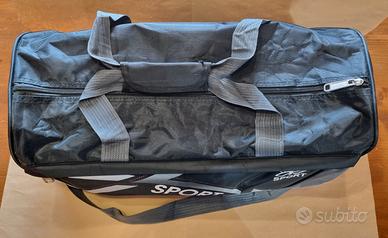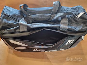 borsone sportivo, di colore nero e grigio, caratterizzato dalla scritta "SPORT" stampata sul lato, un manico centrale e una tracolla regolabile ed una tasca anteriore per gli effetti personali