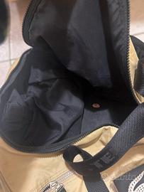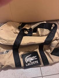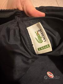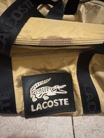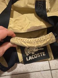 Borsone sportivo o da viaggio ultra comodo e pratico del marchio Lacoste. Ha una tasca nella parte anteriore esterna, una tasca interna e due tasche laterali. Stile vintage, anni 2000. In buone condizioni; nelle foto si puó vedere che alcune zone sono macchiate di nero… ma una volta trattata con acqua e sapone scomparirà tutto! Sono solo difetti estetici: a livello funzionale è il top!
