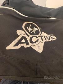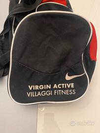 Borsone sportivo Virgin Active con logo Nike, tasca centrale grande e 2 tasche laterali, misure 60x30x30 cm, colori nero rosso e bianco, stampa bianca del logo Virgin Active appena rovinata dovuto all’utilizzo, ma rimane in ottime condizioni