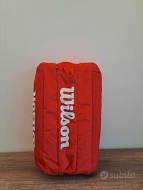 Vendo borsone originale Wilson rosso, 3 scomparti principali, 2 tasche laterali grandi + 1 tasca laterale piccola e scomparto separato per scarpe.