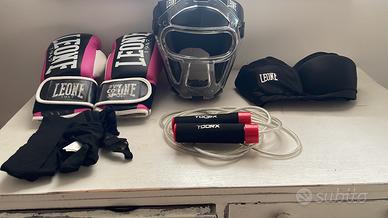 Set completo LEONE taglia 10-13 anni small vendo per inutilizzo praticamente NUOVO set completo o pezzi separati. Anche corda professionale. Set 150 euro oppure Casco 60 euro Guantoni 60 euro corda 15 euro paraseno 25 euro + spese di spedizione