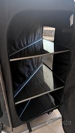 Armadio, angoliera a tre scomparti su tre ripiani, chiusura a cerniera, struttura in alluminio, leggera ma resistente, schienali traspiranti, zanzariera. Montaggio rapido, coperchio rigido (ancora con pellicola protettiva), resistente per appoggi sicuri e stabili, piedini regolabili. Comprensivo di borsa per il trasporto. Dimensioni montato 120x60x110h circa. Usato poco. Regalo a 70 euro.