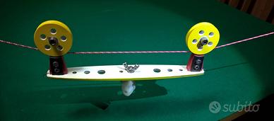In alternativa, aumentando la pendenza del filo, è possibile trainare/rilasciare il carrellino in salita utilizzando per comodità un semplice mulinello per canna da pesca, agganciando la lenza agli appositi occhielli per realizzare riprese ascensionali più lente.
