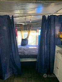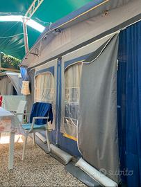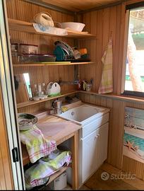 Cucinotto in legno, con elettrodomestici nuovi, zanzariere, scaffali, armadi, ripiani, 6 posti letto (4 in roulotte, 2 in veranda), 2 sdraio con tavolinetto, bel tavolo esterno con 4 sedie coordinate, copertura dell’intera piazzola con telo verde in pvc pesante (0,600 kg/mq).