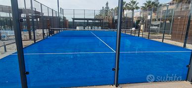 Vendesi n° 3 campi da padel, anche separatamente, costituiti da struttura a tralicci in alluminio di colore grigio antracite con vetri temperati di 12mm. Due sono stati montati nel 2021 e uno nel 2022. Ai primi due, a inizio 2023, sono stati cambiati i tappetini originali con quelli della Mondo ( monofilamento stx 96A a struttura dritta 15mm), il terzo mantiene ancora il tappetino originale Mantoflex erbasint 15mm verde. Tutti montano proiettori da 250W con tre fari a led orizzontali per una migliore visibilità della palla. Ogni campo ha 4 proiettori con tre fari ciascuno. I proiettori sono stati progettati dalla Cappa luci srl di Ragusa appositamente per i campi da padel. I campi si trovano a Scoglitti nel comune di Vittoria in provincia di Ragusa. Smontaggio e trasporto a carico dell’acquirente. Prezzo 10000€ ciascuno