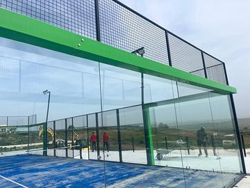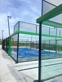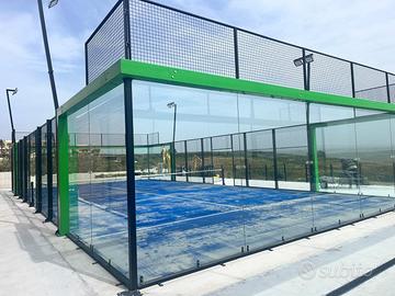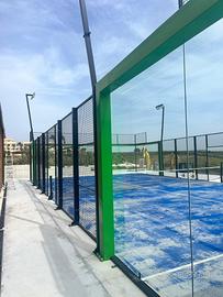 Struttura metalliche zincata per campo da padel panoramico verniciato a polvere più vetri temperati da 12 millimetri più rete con paletti e argano più fari d’illuminazione.