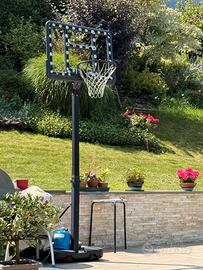 Canestro regolabile in altezza. Base ruote e costituita da serbatoio riempibile con acqua o sabbia.
