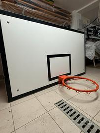 Tabellone e canestro da basket regolamentare FIP. Dimensioni regolamentari del tabellone 180*105, il canestro è sempre stato usato in una palestra da basket indoor, si vende per passaggio a nuovi canestri.