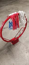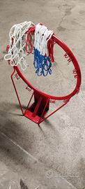 Canestro regolamentare con due reti e istruzioni per il montaggio a muro o tabellone.