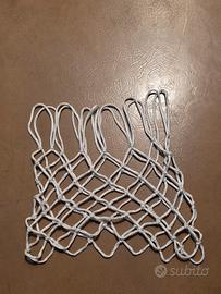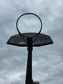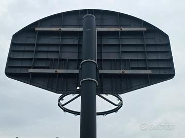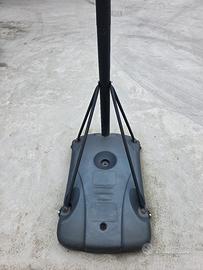 Canestro regolamentare regolabile in altezza con base da riempire con acqua o sabbia (base con possibilità di fissarla al pavimento per dare più stabilità). La rete è stata smontata e lavata. Il pannello presenta una rottura ed è stato rinforzato sul retro.