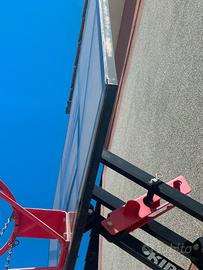 Vendo per ormai inutilizzo , tabellone da fissare a muro regolabile in altezza su tre misure , completo di canestro con rete Street style, tabellone in plexiglass fissato su struttura portante in ferro verniciato. Come visibile in foto ci sono alcuni segni di usura dovuti all'utilizzo, il tabellone è completamente funzionante.