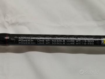 Canna da casting Max Steel nuova mai usata, lunghezza 2,28 in due pezzi. Formata da una parte posteriore con manico e altre due sezioni con potenza di lancio differente. Si può scegliere quella che si vuole usare. Una H che fa 15-30gr e una XH che fa 18-45 gr. Canna ad azione faast. Molto bella. Canna da luccio, o da siluro.