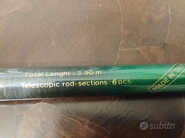 Canna da pesca Mitchell Runner 390 in carbonio di alta qualita, lunghezza 3,9 mt. telescopica in 6 pezzi con manico in sughero. Ottima per pesca sia in acqua dolce, trote e carpe, con galleggiante, ma anche in mare. Solo ritiro in luogo, a Firenze.