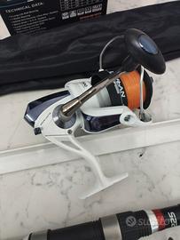 vendo canna da pesca per surf casting utilizzata due volte. Canna Trabucco lunghezza 4.20 metri in tre pezzi. Può lanciare fino a 225 grammi di peso. Unico difetto,come evidenziato in foto,da riparare un passa filo. Insieme cedo il poggia canna. Mulinello praticamente nuovo ma da cambiare il filo un po' invecchiato.