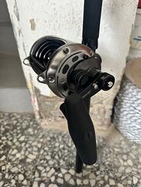 Canna per tonni 50/80lb con carrucole larghe, mulinello 50lb doppia velocità NUOVO. La canna é immacolata non presenta nessun graffio, il mulinello è nuovo uscito una volta sola e con nessun pesce all attivo imbobinato con 450mt di 0,80 ancora con scatola originale.
