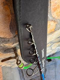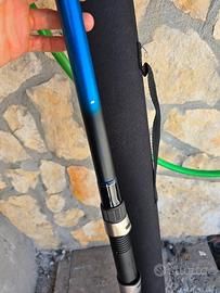 Canna Shimano DX TE Telesurf. Canna telescopica max cast weight 150 grammi. la canna ha qualche pescata all'attivo (una decina). Qualche imperfezione estetica sulla parte passa. Anelli fuji immacolati, placca fuji intatta. Le sezioni della canna scorrono perfettamente, sempre pulita dopo ogni pescata