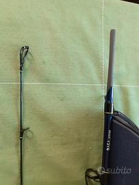 Canna spinning giaponese mare 10-30gr, 2 pz., 2.70m, Seika, carbonio trecciato, con un design futuristico, serigrafia blu notte/ nero, grigio metallico. È dotata di tubo in cordura. Nuova di negozio, mai usata incellophanata.