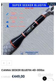 Vendo Super Seeker Bluefin 40/80LB, manico curvo Alutecnos, carrucole Alutecnos2. Vendo per passaggio a canna con anelli. Come si puo’ vedere dalle fotografie la canna e’ praticamente nuova,usata pochissime volte a drifting.