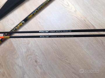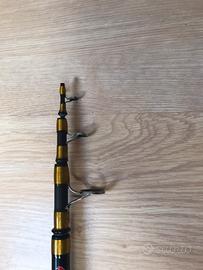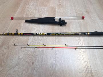 Falcon wild beach extreme, 4.20 metri, 110 grammi. Possiede due cimini, di cui quello giallo si é rotto, rimane il rosso che gestisce fino a 110 grammi quindi la canna é comunque perfettamente utilizzabile.