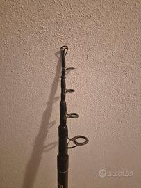 Canna da surfcasting Persicus Mistral 100 Lunghezza 4 metri Potenza di lancio 100 La canna presenta un po' di segni dovuti al normale utilizzo e l'anello apicale è stato sostituito in quanto quello originale si era scheggiato. È comunque perfettamente funzionante.