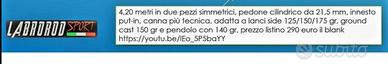 Bellissima due pezzi Labrorod da 4.20m, simmetrica, anellata da rotante, vetta match. Canne leggerissima con pedone da 21,5 mm, anellata fuji.