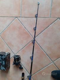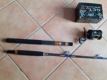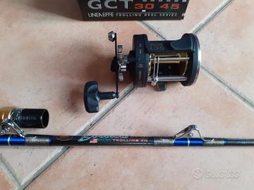 CANNA DA TRAINA BAHAMAS Troller Carrucolata 30lbs +MULINELLO Canna da traina nuova di negozio (mai usata), 2 pezzi, in carbonio, completamente carrucolata . La prima e l'ultima carrucola sono di dimensioni più grandi per facilitarne l'uso * Lunghezza: 180 cm (divisa in 2 pezzi) * Da chiusa: 138 cm * Con manico staccabile * 6 Anelli carrucole in acciaio inox * Casting: 30 lbs, peso 648gr * Portamulinello a vite in alluminio * Impugnatura antiscivolo in E.V.A * Costruita in carbonio a spire intrecciate * Colore serigrafia argento specchio con legature blu + Mulinello da traina GCT45 BELLISSIMO MULINELLO DA TRAINA , NUOVO DI NEGOZIO, MAI USATO CON : * BOBINA IN ALUMINIO CON DISINSERIMENTO AUTOMATICO * TRATTAMENTO ANTISALSEDINE MARINO COMPLETO * FRIZIONE MULTI-DISCO DI PRECISIONE CON COMANDO A STELLA COASSIALE * CICALINO DISINSERIBILE * MANOVELLA DA COMBATTIMENTO IN ACCIAIO INOX * GUIDAFILO *CAPACITA' 330MT - 0.50MM * RECUPERO A ROTAZIONE 80CM * RATIO : 3.8:1 * PESO 520GR