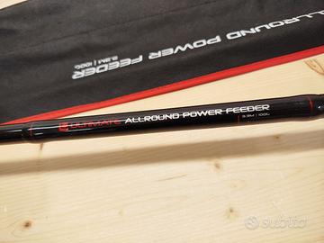 canna da Feeder Ultimate Allround Power Feeder è una canna in carbonio in tre pezzi dotata di tre vette 3.3 MT 100g max. usata una sola volta, nessun segno di usura, il manico è ancora dotato di pellicola protettiva. completa di 3 vette due in fibra e una in carbonio. compreso nel prezzo tripode estensibile in alluminio, vari pasturatori. Guadino allungabile da 2.7 MT in omaggio. solo ritiro a mano