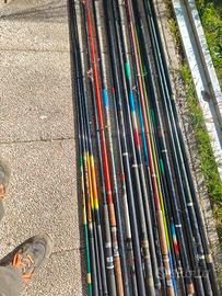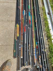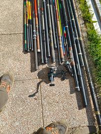 Vendo.. 21 canne da pesca ( DATATE) ma in perfette condizioni.. tutte in carbonio solo due in fenolico. Non hanno crepe né rotture e sulle bolognesi gli anelli sono integri. in descrizione.. - n.8 bolognesi - n.7 fisse con elastico da sponda (carpa) in due da mettere l'elastico . n.6 fisse. regalo manico guadino non in foto e due mulinelli perfettamente funzionanti. Richiesta per il blocco 100 euro NON TRATTABILE.