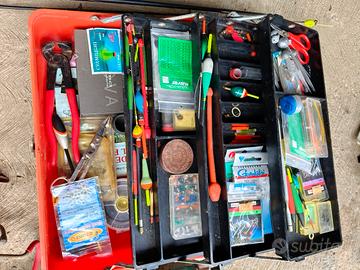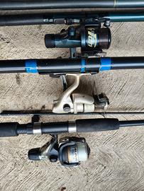 Vendo attrezzatura da pesca composta da 4 canne 3 con relativi mulinelli di marca 1cassetta piena di materiale 2 porta canna e un retino.