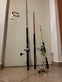 Uno canna da traina 12 libre della trabuco con mulinello finor professionale già imbobinato più una canna da tatachi per pesca calamari. Una per pesca col il sabichi compresa di mulinello e una per traina leggera compresa dí mulinello vendo in blocco