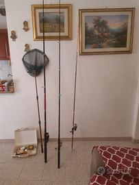 N° 3 canne da pesca Sunshine 576 da 3 mt, Guangzaho da 4.50 mt e Tecnofish World Champion da 2.10 mt, usate pochissimo, tutte complete di mulinello e accessori, vendo in blocco Euro 120, ritiro a mano zona Ostia e limitrofe.