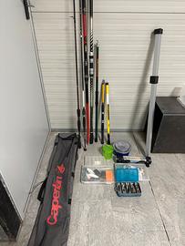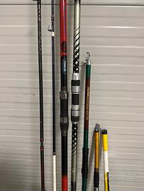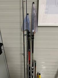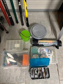Materiale vario da pesca composto da 6 canne da pesca, supporto per spiaggia, sacca e vari contenitori con accessoriatica varia.