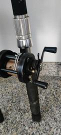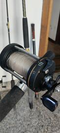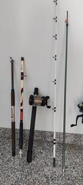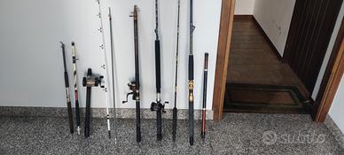 canne da pesca da scoglio e da traina con relativi mulinelli.