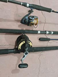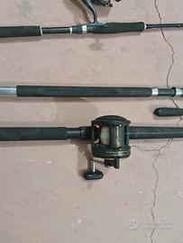 Vendo due canne da pesca da traina una con mulinello e l'altra senza, un'altra canna da spinning con mulinello e una piccolina priva del mulinello. Le canne da pesca sono in ottime condizioni