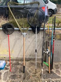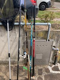 4 canne da pesca 2 fisse + 2 mulinello marche: OMNI 4mt - Valex 3mt + Olympus Mystic competition 4.70 Mt gr 60 con mulinello OKUMA + Astral Spin 2.7Mt con mulinello OKUMA + 3 retini e retino porta pesci e cassetta con attrezzatura varia come da foto. Me li hanno regalati ma io non pesco