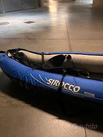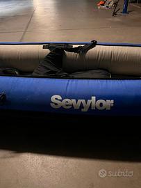 Canoa biposto gonfiabile Sevylor modello SIROCCO. Fornita di sacca di trasporto, due pagaie e due sedili con schienale (la seduta di uno dei due sedili deve avere un buchino perchè non resta gonfio) Misura 310*109 supporta fino a 200kg
