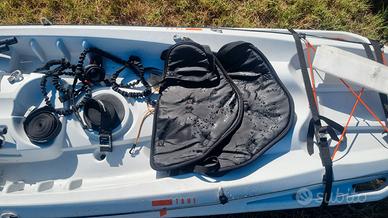 Canoa in condizioni perfette, utilizzata massimo 4 volte. Inclusi con la canoa vengono i suoi poggia schiena, ruote, corde e cinghie, protezioni per le barre porta tutto, elastici per le pagaglie e ovviamente le 2 pagaglie che sono smontabili in 2 pezzi ciascuna. La consegna é disponibile solo nella zona limitrofa di Roma.