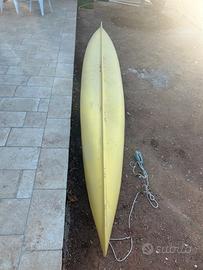 Canoa biposto in vetroresina, colore giallo con design effetto “schizzato”. La canoa è usata ma ancora perfettamente funzionante, ideale per uscite in mare in condizioni tranquille.