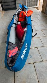 Vendo canoa gonfiabile Sevylor Adventure x 2 persone con coppia pagaie, 2 salvagente pettorali, 1 pompa a pedale, kit riserva tappi gonfiaggio. Usata solo 1 volta lago. 200 euro. Non trattabile.