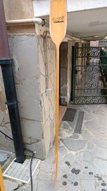 1) canoa monoposto in vetroresina, lunghezza 360 cm e larghezza 60 cm circa, dotata di puntapiedi in alluminio e schienalino regolabili, cuscini gonfiabili anti affondamento e pagaia in legno Azzali standard. Richiesta 250€