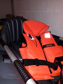 É fornita di remi smontabili, pompa di gonfiaggio e pinna direzionale. Con soli 50 Euro in più, posso fornire 2 giubbotti salvagente, marca Lalizas che offrono il massimo della sicurezza, grazie al sostegno della testa che rimane fuori dall'acqua e al fischietto, per attirare l'attenzione.
