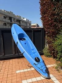 CANOA-KAYAK RIGIDA: Dimensioni: -lunghezza 300cm -larghezza 80cm -altezza 40cm Colore: -blu Componenti Kayak: -manico anteriore -manico posteriore -ruote posteriori -ragno collocato anteriormente -diversi punti di attacco lungo i lati Caratteristiche: -ideale per un adulto e un bambino -molto stabile grazie alla sua struttura e al suo volume -autodrenante -sedili sagomati e gommati -ideale in acque calme -facile da trasportare CARRELLO PER KAYAK: -due ruote gommate per facilitare il trasporto fuori dall’acqua -possibilità di spostare la canoa anche da soli PAGAIA KAYAK (214cm): -smontabile in 2 parti -inclinazione regolabile -alluminio -leggera -fermagoccia inclusi