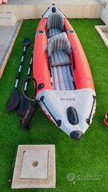 bellissimo e nuovissimo kayak gonfiabile marca Intex, ideale per escursioni in famiglia, è dotato di tutto l'occorrente per usarlo, pompa, remi porta canne, porta cellulare, manometro per monitorare la pressione, 2 sedili più un terzo cuscino per bambino/a. si può considerare 3 posti. è molto robusto con gomma telata. tenuto benissimo, ogni stagione è stato lavato e confezionato con talco per preservare la gomma. disponibile per altre info. lo vendo perché non posso più usarlo.