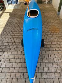 Vendo Canoa/Kayak in vetroresina , completa di pagaia in legno, carrello ( in foto) e pinna rimovibile. Lunghezza 415 cm . Misure pozzetto : 70 x 40 cm.