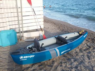 Vendo canoa kayak Sevylor Adventure 2 posti gonfiabile. Perfettamente funzionante. Normali segni di usura (qualche segno di scucitura vicino la maniglia di trasporto che non pregiudica il funzionamento). Solo kayak, non vendo pagaie.