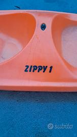 Canoa in polietilene per ina persona più un bambino che può posizionarsi nella parte posteriore. Comoda seduta con impronta anatomica, facile, divertente da usare e veloce sull'acqua. Pagaia inclusa nel prezzo. Visibile sul lago Maggiore.