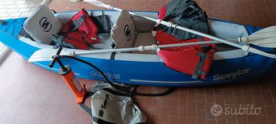 vendo canoa 2 posti con sedili. compreso 2 pagaie 2 giubbetti salvagente . pompa .e pinna sotto chiglia.tenuta bene sempre lavata con acqua dolce .